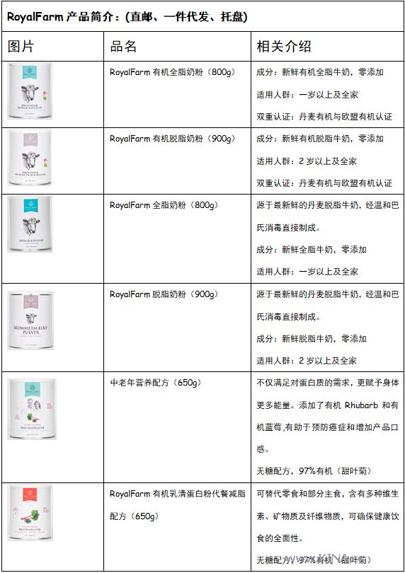 RoyalFarm产品:RoyalFarm来自于世界食品最安全的国度——丹麦。丹麦是世界上最幸福和最绿色的国度,丹麦人民拥有世界上最绿色的生活方式。他们认为,世界上的每一个人都有权利享有健康快乐的生活。正是在这样的理念下,RoyalFarm在对自然的尊重与对新鲜食材的珍爱中生产出了100%的有机产品,希望通过RoyalFarm架起一座桥梁让世界上更多的人们能够喝到好牛奶,让人们在品尝美好味道的同时能够拥有更加健康绿色的生活。